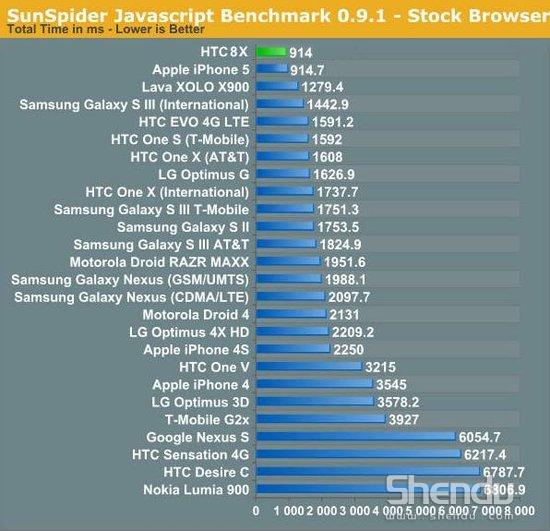 近日,國外流行科技網(wǎng)志與播客癮科技(Engadget)的工作人員對(duì)幾款高端智能手機(jī)(HTC 8X、iPhone 5、三星 Galaxy S III 等等)進(jìn)行了一些基準(zhǔn)測試,其中包括公認(rèn)值得參考的SunSpider JavaScript瀏覽器測試,由于網(wǎng)頁大量使用了 AJAX技術(shù),通過這項(xiàng)基準(zhǔn)測試可以得到瀏覽器能以多快的速度執(zhí)行JavaScript,這個(gè)速度會(huì) 直接關(guān)系到手機(jī)打開網(wǎng)頁的速度。
