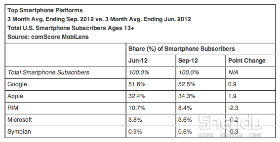 從操作系統來看,谷歌Android平臺第三季度仍在美國市場上占據主導地位,所占份額為52.5%,比第二季度增長近1個百分點;蘋果排名第 二,其iOS平臺所占份額為34.3%,環比增長1.9%。與此同時,RIM、Symbian和微軟Windows Phone所占份額均有所下滑,其中RIM所占份額從10.7%下降至8.4%,Symbian從0.9%下降至0.6%,Windows Phone從3.8%下降至3.6%。 comScore報告與其他研究報告發布的數據相一致,均表明蘋果和三星與其他競爭對手之間的差距正在拉大,這兩家公司控制著整個行業的絕大多 數利潤,其最新的旗艦手機iPhone 5和Galaxy S3正幫助兩家公司繼續占據市場主導地位,令摩托羅拉移動等競爭對手備受重壓;而與此同時,中興通訊等低價手機廠商則正在低端市場上給其他廠商造成壓力。
