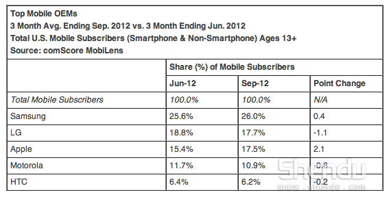 市場研究公司comScore周五發布報告稱,第三季度三星和Android操作系統仍在美國移動市場上占據主導地位,但蘋果所占份額的環比增幅則是最高的。報告顯示,在對3萬多名美國移動用戶進行調查后發現,三星第三季度在美國手機(包括智能手機和非智能手機)市場上所占份額為26%,略高于第二 季度的25.6%;LG排名第二,所占份額為17.7%,環比下滑1.1個百分點,略高于蘋果;蘋果份額為17.5%,比第二季度增長2.1%;摩托羅拉 第四,從11.7%下降至10.9%;HTC第五,從6.4%下降至6.2%。