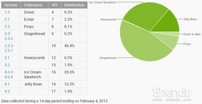 Android Developers Dashboard給出了最新一期的Android各個版本操作系統所占的市場份額,數據顯示,Android 4.0以上的版本份額已經攀升至42.6%,比較新的Android 4.1果凍豆以上版本的份額也已經達到了13%。但是與此同時,也仍然有非常大一部分用戶、大約45.6%仍然停留在Android 2.3的時代。