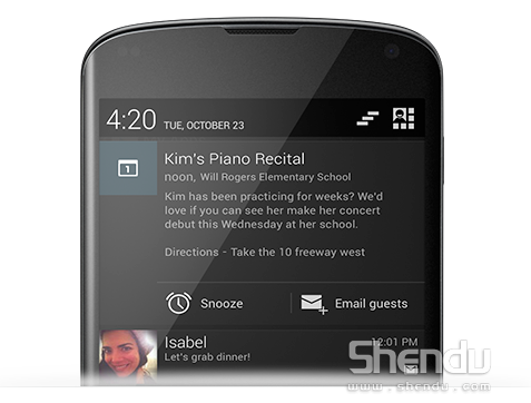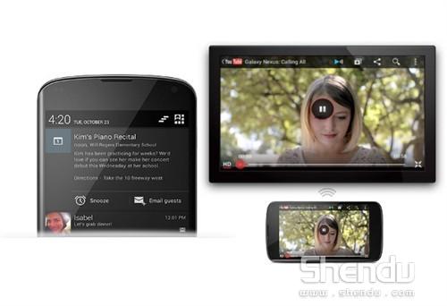 在手機的輸入界面,用戶可以連續在鍵盤上滑動,手機將會根據滑動的軌跡識別出輸入的文字,這種輸入方式將會提升輸入的速度,當然,初次使用該功能在輸入準確度方面可能會比較差,熟悉之后就會有較為不錯的輸入體驗。在手機的通知界面,用戶可以快速跳轉到設置界面,在通知界面還可以切換手機不同的使用模式。原來切換賬戶的時候必須要在設置界面完成,現在在解鎖界面也可以快速的切換不同的賬戶。Miracast功能可以將手機中的游戲或者視頻通過無線的方式將畫面投射到兼容的電視上,分享變得更加簡單。升級后的Google Now可以大大降低手機日歷功能的使用頻率,因為在重要日期來臨之前,它都會進行提示。通知欄改進Android4.2 系統的整體改進并不明顯,但是新加入的這些功能都是比較實用的,該系統將會直接內置在Nexus 4以及Nexus 10當中,在未來幾周之內,GALAXY Nexus以及Nexus 7將會收到系統升級提示,至于其他Android設備的系統升級日期暫時還無法確定。