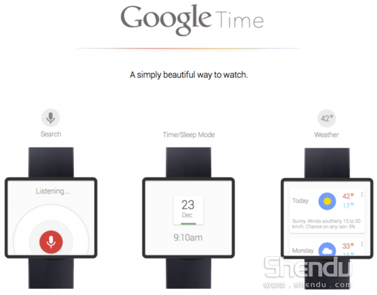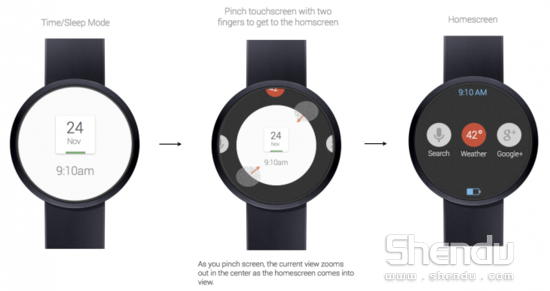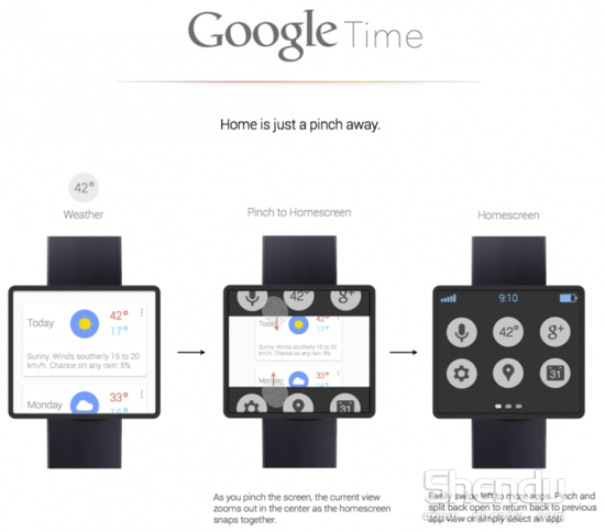 在麥克布洛克的設(shè)計(jì)草圖中,這款設(shè)備具備了聲控功能并搭載了一塊高靈敏度觸摸屏幕,且與谷歌語(yǔ)音助手服務(wù)Google Now進(jìn)行了完美整合。此外,該設(shè)備可以同用戶的谷歌賬戶進(jìn)行同步,并可以在屏幕上告知用戶有關(guān)下一個(gè)會(huì)議、航班延誤、生日等信息。值得一提的是,用戶只需要在這款“智能手表”的屏幕上進(jìn)行“兩指捏合”的手勢(shì)便可以隨時(shí)調(diào)出主頁(yè)界面。