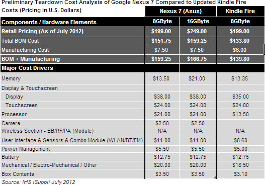 研究公司HIS iSuppli發(fā)布了一個Google Nexus 7的拆機圖。HIS iSuppli表示:8G版Nexus 7的成本價格約為159.25美元,16G版Nexus 7的成本價格166.75,但銷售價格為249美元,對于谷歌來說,只多花了7.5美元(約50元人民幣),但是銷售價格卻抬高了50美元(約300元人民幣)。
