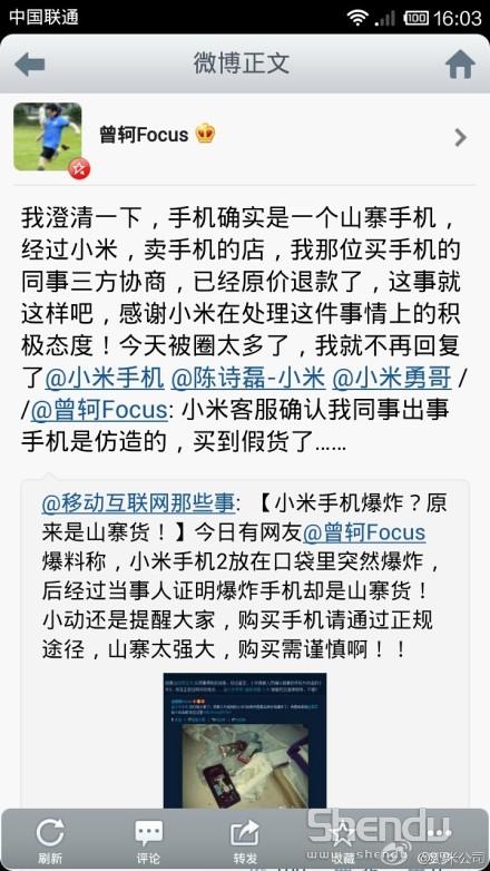 日前,小米公司發(fā)布聲明稱:爆炸的手機是假冒小米手機。據悉,一位用戶2月8日在重慶賽博廣場某手機銷售柜臺購機,2月21日電池炸裂。今天小米發(fā)布了一個嚴正申明。小米提醒用戶:請通過小米網、聯(lián)通/電信營業(yè)廳渠道購買。同時,對惡意造謠此事的媒體及個人,保留法律追究權利。