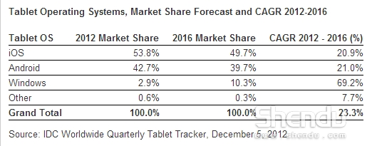 另外,電子書市場將萎縮,2011年電子書出貨量為2770萬部,2012年將縮減為2000萬部。在操作系統(tǒng)方面,2012年iOS的市場份額為53.8%,而Android為42.7%。IDC預(yù)測,2016年,iOS的份額將降低至49.7%,而Android份額也將降低至39.7%。至于Windows系平板電腦,仍是滄海一栗,第三方采用Windows系統(tǒng)的平板電腦加上微軟自己的Surface,只占2012年平板電腦出貨量的2.9%。此數(shù)值將會在2016年提升至10%。