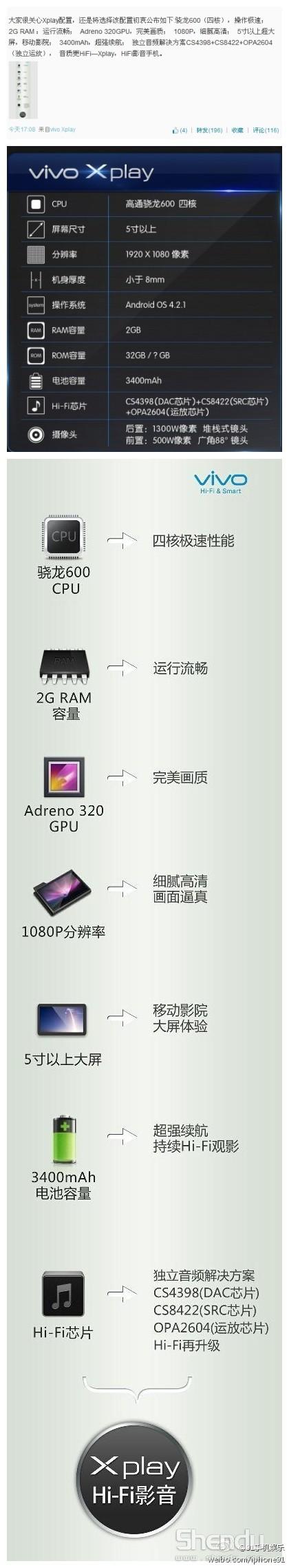 昨天晚些時(shí)候,vivo公布Xplay官方參數(shù):主頻1.7G驍龍600四核CPU, Adreno 320GPU,2G RAM +32G ROM,5寸以上1080P高清屏,機(jī)身厚度小于8mm,3400mAh電池,后置1300W+前置500W廣角88°攝像頭,獨(dú)立音頻解決方案CS4398+CS8422+OPA2604(獨(dú)立運(yùn)放),音質(zhì)更HiFi!