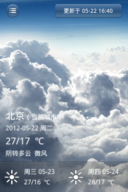 在天氣應用中,在聯網的情況下手機可以獲取當前城市的天氣情況,并且提供未來兩天的天氣預報,幫助用戶更好的安排未來的行程。