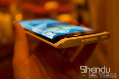 原型機(jī)目前缺少智能手機(jī)的基礎(chǔ)功能,比如通話、拍照等等,系統(tǒng)界面也只是虛擬的動(dòng)態(tài)圖片。處在斜面部分的屏幕會(huì)呈現(xiàn)與正面屏幕不同的信息,比如顯示快捷圖標(biāo)和文字信息,或是滾動(dòng)顯示股票信息等等。