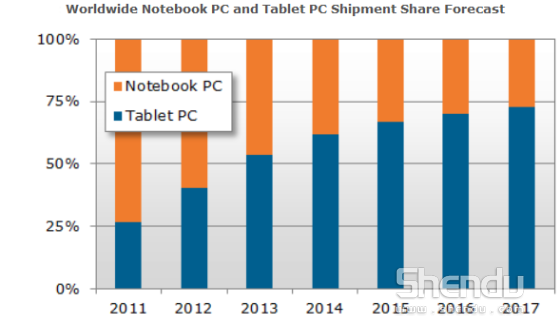 日前,美國市場研究公司NPD DisplaySearch發(fā)布報告稱,今年平板電腦全球銷售量將達(dá)到2.4億臺以上,超過筆記本的2.07億臺。NPD預(yù)計(jì),今年平板電腦在全球個人計(jì)算設(shè)備市場上所占份額將首次超過50%,高于去年的38%和2011年的26%。