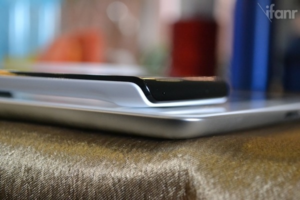 P1 的手機厚度是 7.69 毫米。光看數據是沒有切實感受的,我讓它和“牛排”比一比,盡管 P1 實際上是薄一點點,但因為“牛排”邊緣的設計,光用肉眼不太容易看得出來。它的重量是 110 克,很輕盈,手感有點像 Galaxy S II,輕飄飄的。