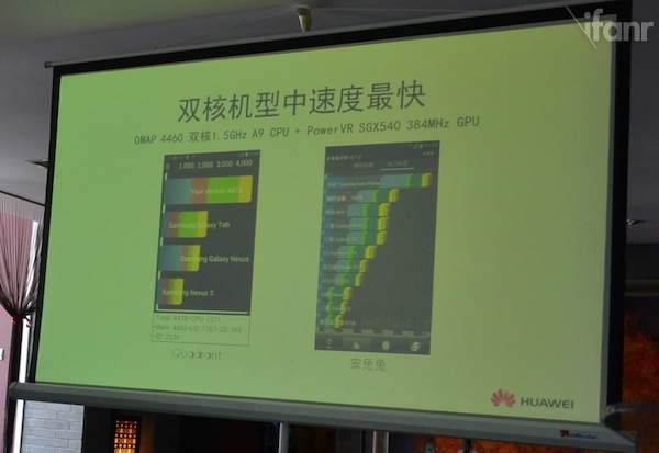 李小龍在展示這部手機的性能時,和其他手機進行了對比,從當場演示的圖片上看,除了華碩四核平板以外,P1 的性能得分是最高的。