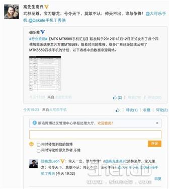 而在配置方面,通過大可樂手機高層的微博依然可以捕捉到某些訊息。高興華轉發了樂蛙官博“匯總2013年采用MTK6589芯片手機廠家的行業資訊”,并進行了簡短評論。