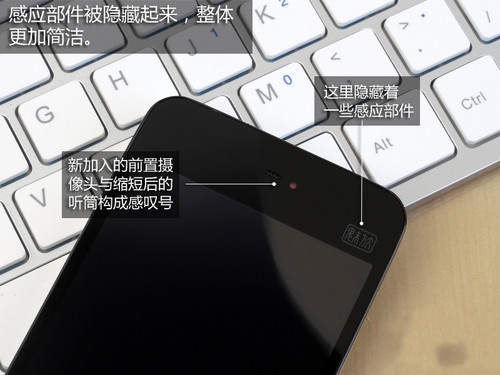 聽筒比起M9變短了,看上去更為簡潔,此外MX也終于加入了M9所沒有的前置攝像頭,和聽筒放在一起,看上去像個感嘆號。整體感覺也是緊密有致。右側(cè)有環(huán)境光度以及紅外距離的感應(yīng)部件,不過被隱藏了起來,看上去很簡潔。