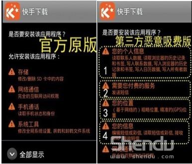 智能手機客戶端日益普及,下載軟件的使用頻率已經(jīng)非常高了,惡意軟件的制作者也盯上了這一區(qū)域。通過圖片可以看出快手下載的盜版客戶端已經(jīng)出現(xiàn)。